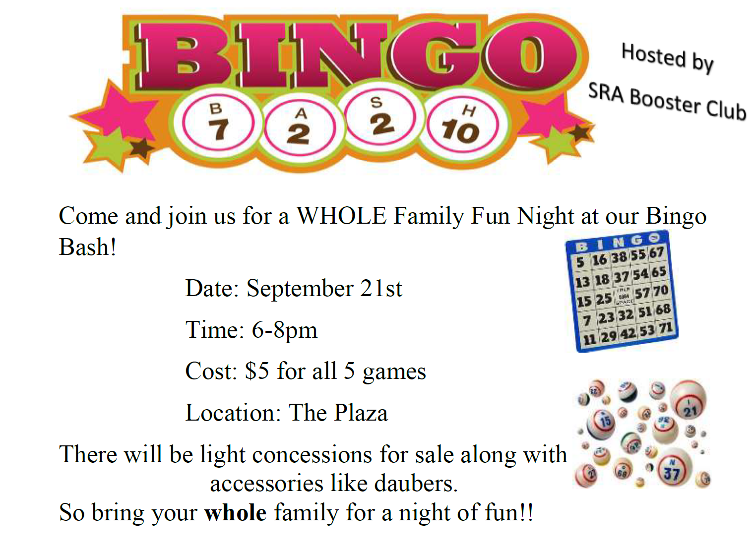 The Booster Club will be hosting a Family Bingo Night on Friday, September 21st from 6-8pm in the Plaza.