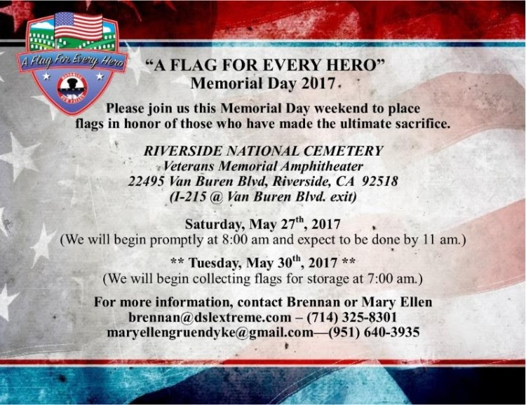 Memorial Day is fast approaching A Flag for Every Hero is once again looking for volunteers to help place flags in Riverside National Cemetary.