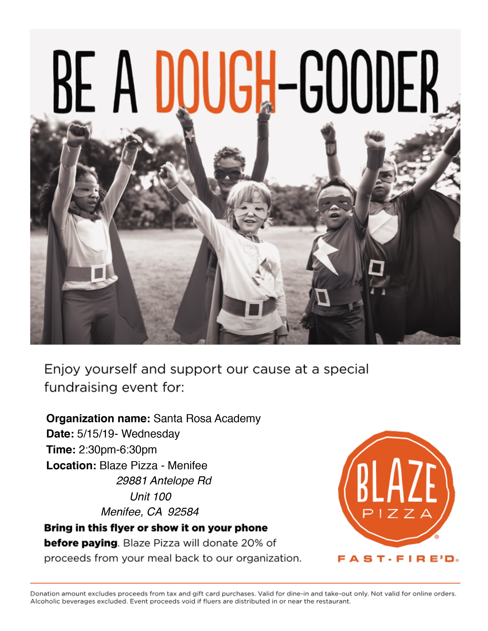 Blaze Pizza Fundraiser – Wednesday, May 15th Stop by Blaze Pizza and support our SRA Fundraiser. On Wednesday, May 15th from 2:30-6pm at Blaze Pizza in Menifee located at 29881 Antelope Rd Unit 100 show our flyer and Blaze Pizza will donate 20% back to SRA. Download Flyer May 7th, 2019| Share This Story, Choose Your Platform! facebooktwitterEmail Related Posts