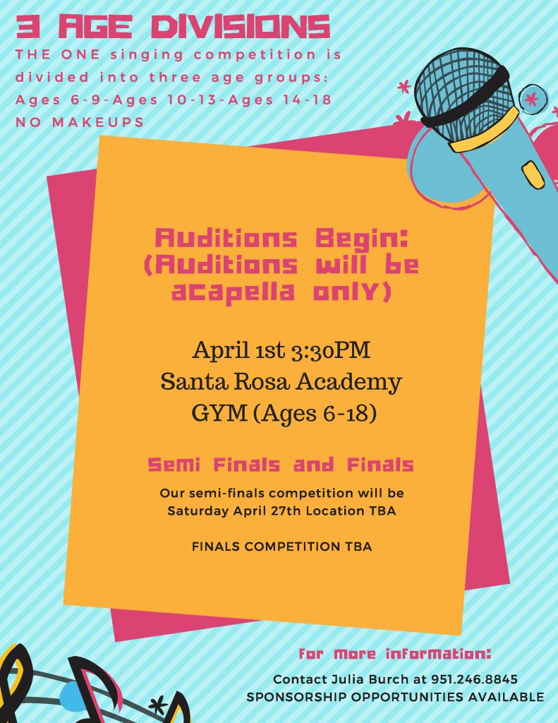 Auditions for the Boys and Girls Club annual The One singing competition will be held on Monday, April 1st in the Santa Rosa Academy Gym.  Auditions are open for ages 6-18.  Good luck singers. For more information contact the Boys and Girls Club.