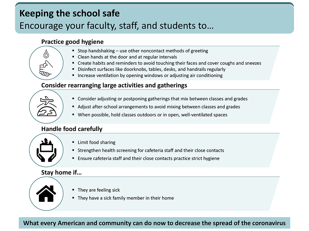 Students with a temperature of 100 degrees and higher or persistent, dry cough will be asked to go home, and staff will be invited to ‘self-monitor’ every day for their own subjective fever and any signs of respiratory illness before entering their classrooms. Hand sanitizers have been placed throughout the campus for better student and staff access and we continue to encourage everyone to wash their hands frequently.