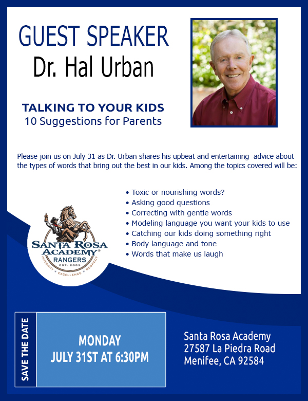 Our Executive Director has him speak several times in Washington, D.C, and highly recommends parents to attend. Santa Rosa Academy is paying for the event which is free for parents. Read more about Dr. Hal Urban at www.halurban.com.