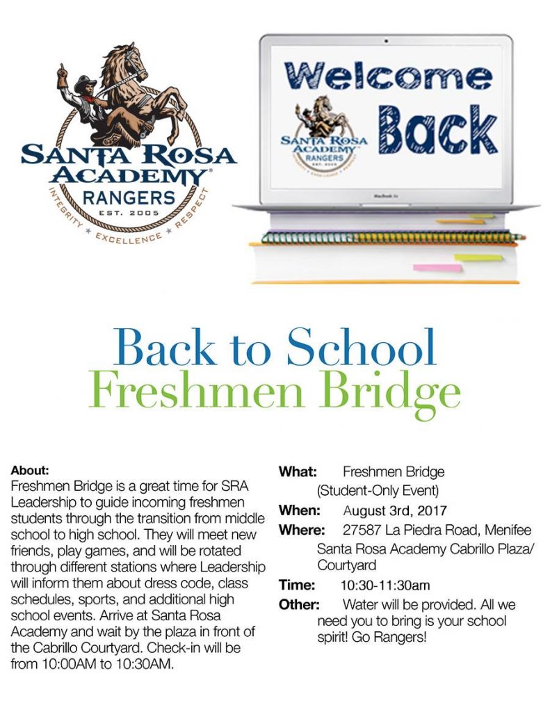 Freshman Bridge Class of 2021 All incoming Freshman are invited to the Freshman Bridge on Thursday, August 3rd from 10:30-11:30am. July 28th, 2017| Share This Story, Choose Your Platform! facebooktwitterEmail Related Posts