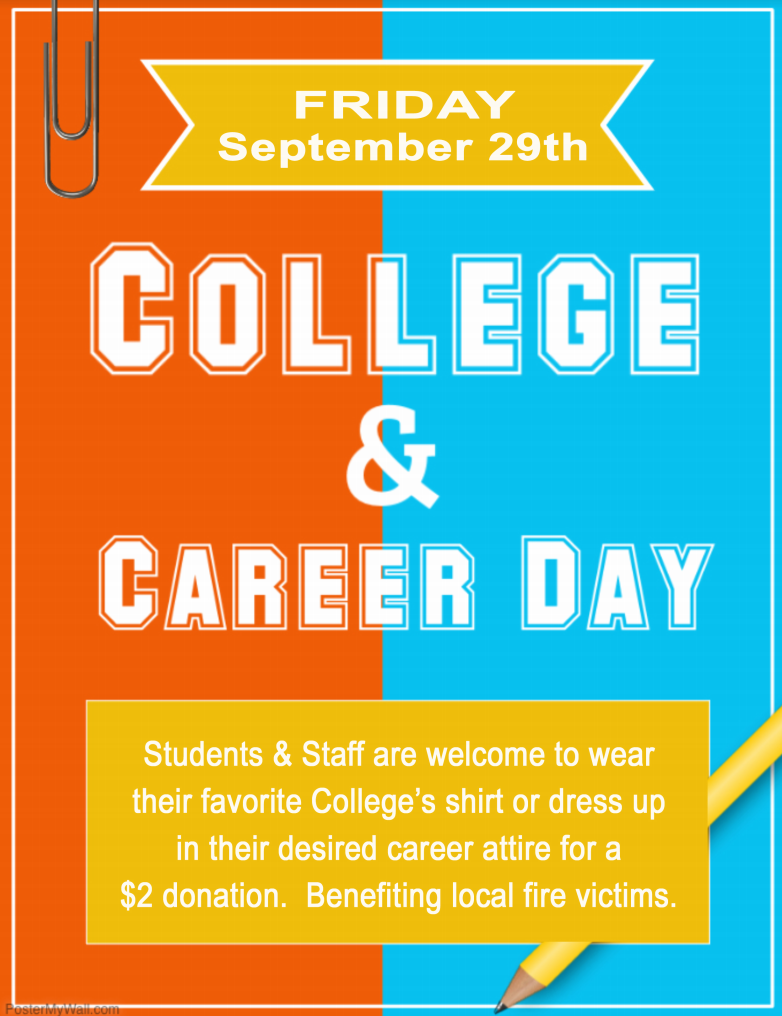 Santa Rosa Academy's 3rd Annual College & Career Day On Friday, September 29th we will have vendors coming to campus as well as a speaker for our high school students. Middle school students will be participating in activities and elementary students will speakers coming to the classrooms. College & Career Day - Friday. Wear a