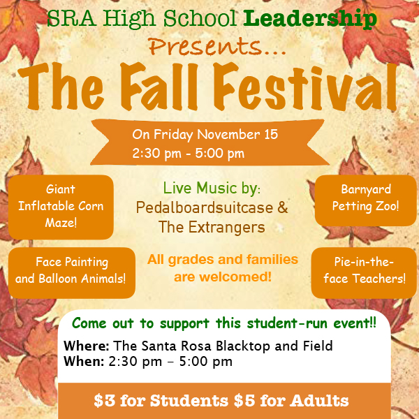 Join us for the Fall Festival on Friday, November 15th at 2:30 pm. Tickers are $3 for students and $5 for adults. Tickets can be purchased online at www.events.sra.mn. The Fall Festival is put on by the SRA High School Leadership students.